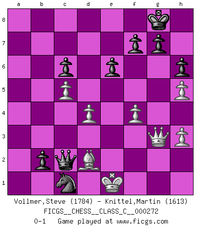 Last move : 0-1 2019 September 8 2:16:6 [Event "FICGS__CHESS__CLASS_C__000272"] [Site "FICGS"] [Date "2019.08.03"] [Round "1"] [White "Vollmer,Steve"] [Black "Knittel,Martin"] [Result "0-1"] [WhiteElo "1784"] [BlackElo "1613"] 1.Nf3 d5 2.d4 Nf6 3.g3 Bf5 4.Bg2 c6 5.O-O h6 6.c4 e6 7.b3 Nbd7 8.Bb2 Be7 9.Nc3 Qb6 10.c5 Qc7 11.Rc1 O-O 12.e3 b6 13.b4 Qb7 14.Qe2 Bg6 15.Rfd1 Rfc8 16.a3 a5 17.Ra1 Rcb8 18.Rd2 Bd8 19.Nh4 Bh7 20.e4 axb4 21.axb4 Rxa1+ 22.Bxa1 Nxe4 23.Nxe4 dxe4 24.Bxe4 Bxe4 25.Qxe4 Bg5 26.Rd1 Nf6 27.Qg2 Bxh4 28.gxh4 Nd5 29.Bb2 b5 30.Bc1 Kh8 31.Bd2 Ra8 32.Qg3 Qe7 33.Rb1 Qf6 34.Qg4 Ra2 35.Be1 Kg8 36.h5 Qf4 37.h3 Ra3 38.Rd1 Qf6 39.Bd2 Rd3 40.Be1 Rxd1 41.Qxd1 Qf5 42.Qg4 Qb1 43.Kf1 Nxb4 44.Qh4 Nd3 45.f4 b4 46.Ke2 b3 47.Bd2 Qc2 48.Qg3 Nc1+ 49.Ke1 b2 0-1 Reti Opening Kingside Castling by player White (move 5) Kingside Castling by player Black (move 11) Player Black won this chess game. Follow this game move after move (download)A man without frontiers. He didn't divide the East and the West, he brought them together in their admiration for him. (Ljubomir Ljubojevic, about Bobby Fischer's death) Warum muß ich gegen diesen IDIOTEN verlieren? (Aaron Nimzowitsch) El Ajedrez es un expediente tonto que hace creer a la gente inactiva que hacen una cosa muy astuta cuando solamente estan perdiendo su tiempo. (George Bernard Shaw) Nous sommes les pions de la mystérieuse partie d'Echecs jouée par Dieu. Il nous déplace, nous arrête, nous pousse encore, puis nous lance un à un dans la boîte du Néant. Epitaphe sur la tombe de David Janowsky (1868-1927). If you have any trouble condescending, find a Unix user to show you how it's done. (Scott Adams)