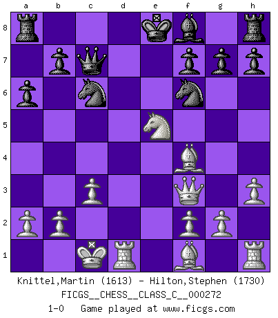 Last move : 1-0 2019 August 16 13:39:47 [Event "FICGS__CHESS__CLASS_C__000272"] [Site "FICGS"] [Date "2019.08.03"] [Round "1"] [White "Knittel,Martin"] [Black "Hilton,Stephen"] [Result "1-0"] [WhiteElo "1613"] [BlackElo "1730"] 1.e4 c5 2.Nf3 a6 3.c3 d5 4.exd5 Qxd5 5.d4 Nc6 6.dxc5 Qxc5 7.Be3 Qa5 8.Na3 Qc7 9.Nc4 Bg4 10.Bb6 Qc8 11.Be3 Qc7 12.h3 Bxf3 13.Qxf3 Nf6 14.Bb6 Qc8 15.O-O-O e6 16.Be3 Qc7 17.Bf4 e5 18.Nxe5 1-0 Sicilian : O'Kelly variation Queenside Castling by player White (move 15) Player White won this chess game. Follow this game move after move (download)Chess is a terrible game. If you have no center, your opponent has a freer position. If you do have a center, then you really have something to worry about ! (Siegbert Tarrasch) Ohne Leiden bildet sich kein Charakter. (Ernst Freiherr von Feuchtersleben) Nunca antes ha habido un jugador de Ajedrez con tal conocimiento a fondo de las complejidades del juego y una inmensa voluntad absolutamente indomable de ganar. Yo pienso que Fischer es el jugador mas grande que jamás haya existido. (Lisa Lane) On a dit que l'homme se distingue de l'animal par le fait qu'il achète plus de livres qu'il ne peut en lire. Je voudrais suggérer qu'inclure à la liste des livres quelques livres d'échecs rendrait la distinction manifeste. (Edward Lasker) Statistics can be made to prove anything - even the truth. (Author unknown)