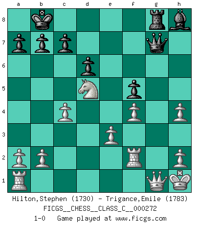 Last move : 1-0 2019 September 8 7:49:18 [Event "FICGS__CHESS__CLASS_C__000272"] [Site "FICGS"] [Date "2019.08.03"] [Round "1"] [White "Hilton,Stephen"] [Black "Trigance,Emile"] [Result "1-0"] [WhiteElo "1730"] [BlackElo "1783"] 1.d4 Nf6 2.Nf3 g6 3.Bf4 Bg7 4.e3 d6 5.Be2 Nh5 6.Bg5 h6 7.Bh4 g5 8.Nfd2 gxh4 9.Bxh5 e5 10.dxe5 Nc6 11.O-O Nxe5 12.Nc3 Be6 13.Nf3 Qd7 14.Nxe5 Bxe5 15.Bf3 O-O-O 16.Nd5 Rhg8 17.c4 Bh3 18.Kh1 Bg4 19.Bxg4 Rxg4 20.f4 Bh8 21.Ne7+ Kb8 22.Nd5 Rdg8 23.Rf2 h3 24.g3 h5 25.Qf3 h4 26.gxh4 f5 27.Qxh3 Qg7 28.Qf1 Rg1+ 29.Qxg1 1-0 King's Indian : London system Kingside Castling by player White (move 11) Queenside Castling by player Black (move 15) Player White won this chess game. Follow this game move after move (download)Chess is life. (Bobby Fischer) Wenn Schach ein enormer Dschungel ist, der seine Myriaden von Geheimnissen nicht preisgeben will, dann sind Computer die Kettensägen einer gewaltigen ökologisch unsensiblen Nutzholzfirma. (Nigel Short) El Ajedrez era la lengua materna de Capablanca. (Reti) Shah mat. Le roi est mort. Cri de fierté d'un joueur venant de terrasser son adversaire, courtoisement, sans effusion de sang. You must do what you feel is right... of course. (Obi-Wan Kenobi in Star Wars ep.4)