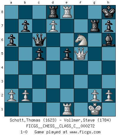 Last move : 1-0 2019 September 22 21:36:44 [Event "FICGS__CHESS__CLASS_C__000272"] [Site "FICGS"] [Date "2019.08.03"] [Round "1"] [White "Schott,Thomas"] [Black "Vollmer,Steve"] [Result "1-0"] [WhiteElo "1623"] [BlackElo "1784"] 1.d4 Nf6 2.c4 g6 3.Nc3 Bg7 4.e4 d6 5.Nge2 O-O 6.Ng3 c5 7.d5 e6 8.Be2 exd5 9.cxd5 Nbd7 10.O-O Re8 11.Bf4 Ne5 12.Qd2 Bg4 13.f3 Bd7 14.Bg5 Bc8 15.Bb5 Ned7 16.Rae1 a6 17.Bxd7 Bxd7 18.f4 Qc7 19.e5 dxe5 20.d6 Qc6 21.f5 gxf5 22.Nxf5 Bxf5 23.Bxf6 Bxf6 24.Rxf5 Re6 25.Ne4 Bg7 26.Rxf7 Bh6 27.Qf2 Rc8 28.Qf5 Rg6 29.d7 Rd8 30.Re7 Rg7 31.Nf6+ Kh8 32.Re8+ 1-0 King's Indian : Kramer system Kingside Castling by player Black (move 5) Kingside Castling by player White (move 10) Player White won this chess game. Follow this game move after move (download)The passion for playing Chess is one of the most unaccountable in the world. (H.G. Wells) Kostenjuk hat keinen Sexappeal. (Loek van Wely) Hasta este punto, las blancas han seguido un análisis bien conocido. Pero ahora el hace un error fatal: empieza a usar su propia cabeza. (Siegbert Tarrasch) Le thème de l'attaque double intervient d'une manière ou d'une autre dans l'immense majorité des combinaisons. (Youri Averbakh) If I had no sense of humor, I would long ago have committed suicide. (Mahatma Gandhi)