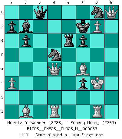 Last move : 1-0 2020 February 15 10:48:39 [Event "FICGS__CHESS__CLASS_M__000083"] [Site "FICGS"] [Date "2019.08.03"] [Round "1"] [White "Marciz,Alexander"] [Black "Pandey,Manoj"] [Result "1-0"] [WhiteElo "2223"] [BlackElo "2293"] 1.d4 Nf6 2.c4 e6 3.Nc3 Bb4 4.f3 O-O 5.a3 Bxc3+ 6.bxc3 d5 7.cxd5 exd5 8.e3 c5 9.Bd3 b6 10.Ne2 Re8 11.O-O Nc6 12.Ra2 Qd6 13.g4 Ne7 14.Ng3 Be6 15.Kh1 Rac8 16.Rg1 Rc7 17.Rag2 g6 18.Qd2 Bc8 19.h3 Rd8 20.Bb2 Nc6 21.Qf2 Bb7 22.h4 Ne7 23.Rf1 Qe6 24.h5 g5 25.Nf5 Kf8 26.Bc1 Qd7 27.e4 dxe4 28.Bxg5 exf3 29.Bh6+ Ke8 30.Ng7+ Kf8 31.R2g1 Nfg8 32.Ne6+ Ke8 33.Nxd8 Qxd8 34.Bf4 Rc8 35.Re1 Kf8 36.g5 cxd4 37.cxd4 Qd7 38.Kh2 Rd8 39.Bxh7 Qxd4 40.Kg3 Qd7 41.Rd1 Qc8 42.h6 Rd7 43.Bb1 Nd5 44.Qd4 f6 45.g6 Re7 46.g7+ Kf7 47.h7 Re6 48.h8Q 1-0 Comment by player 2 : Manoj Pandey : handshake - my 13...Nd7 ?excellently refuted! But my Game 117896 Marciz,Alexander v I (Black "Pandey,Manoj") isnt working - pl help - ok call referree is an option. Nimzo-Indian : Kmoch variation Kingside Castling by player Black (move 4) Kingside Castling by player White (move 11) Promotion Queen by player White (move 48) Player White won this chess game. Follow this game move after move (download)Chess is a foolish expedient for making idle people believe they are doing something very clever when they are only wasting their time. (George Bernard Shaw) Auf Remis zu spielen ist gewissermaßen ein Verbrechen gegen das Schachspiel. (Mikhail Nekhemyevich Tal) Aquel que ve no otra dirección en el juego que la de dar Jaque Mate a su oponente, nunca será un buen jugador de Ajedrez. (Euwe) Il n'y a pas de prix trop élevé au scalp de l'ennemi. (Koblentz) Art is the triumph over chaos. (John Cheever)