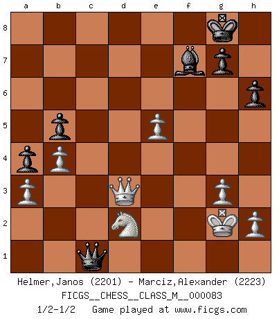 Last move : 1/2-1/2 2020 January 9 4:37:46 [Event "FICGS__CHESS__CLASS_M__000083"] [Site "FICGS"] [Date "2019.08.03"] [Round "1"] [White "Helmer,Janos"] [Black "Marciz,Alexander"] [Result "1/2-1/2"] [WhiteElo "2201"] [BlackElo "2223"] 1.c4 e5 2.Nc3 Nf6 3.Nf3 Nc6 4.g3 d5 5.cxd5 Nxd5 6.Bg2 Nb6 7.d3 Be7 8.Be3 O-O 9.O-O Re8 10.Rc1 Bf8 11.Ne4 h6 12.Qc2 a5 13.a3 a4 14.Rfe1 Be6 15.Nfd2 Nd7 16.Nc5 Nxc5 17.Bxc5 Bd6 18.Qc3 Qe7 19.e3 Qd8 20.Ne4 Ba2 21.Ra1 Bb3 22.d4 f5 23.Bxd6 cxd6 24.Nd2 Bf7 25.dxe5 dxe5 26.Nc4 Qc7 27.Red1 Rad8 28.Bf1 Bd5 29.Rd2 f4 30.Rad1 Bf3 31.Rc1 fxe3 32.fxe3 e4 33.Rxd8 Rxd8 34.Rc2 Bh5 35.Rd2 b5 36.Rxd8+ Qxd8 37.b4 Be8 38.Nd2 Qd5 39.Be2 Bf7 40.Kf2 Ne5 41.Qd4 Nd3+ 42.Bxd3 Qf5+ 43.Kg2 exd3 44.e4 Qc8 45.Qxd3 Qc1 46.e5 1/2-1/2 English Opening Kingside Castling by player Black (move 8) Kingside Castling by player White (move 9) This chess game ended in a draw. Follow this game move after move (download)Via the squares on the chessboard, the Indians explain the movement of time and the age, the higher influences which control the world and the ties which link Chess with the human soul. (Al-Masudi) Ein Großmeister muß tausende Partien in seinem Kopf speichern, denn diese sind für Ihn, was die Worte der Muttersprache für gewöhnliche Leute sind, oder Noten für Musiker... (Garry Kasparov) Debes de llevar a tu oponente hacia un profundo y obscuro bosque donde 2+2=5, y el camino que conduce a la salida es suficientemente ancho para solamente uno. (Mikhail Tal) Les Echecs représentent une sphère d'idées créatrices basée sur la volonté des deux protagonistes. (Smyslov) Waiting for chance ? Play in casinos. (FICGS proverb)