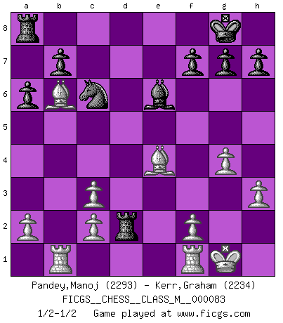 Last move : 1/2-1/2 2019 December 25 2:27:17 [Event "FICGS__CHESS__CLASS_M__000083"] [Site "FICGS"] [Date "2019.08.03"] [Round "1"] [White "Pandey,Manoj"] [Black "Kerr,Graham"] [Result "1/2-1/2"] [WhiteElo "2293"] [BlackElo "2234"] 1.e4 c5 2.Nf3 d6 3.d4 cxd4 4.Nxd4 Nf6 5.Nc3 a6 6.h3 e6 7.g4 d5 8.exd5 Nxd5 9.Nde2 Bb4 10.Bg2 O-O 11.O-O Bxc3 12.Nxc3 Nxc3 13.bxc3 Qc7 14.Rb1 Nc6 15.Be3 e5 16.Bc5 Rd8 17.Bb6 Rxd1 18.Bxc7 Rd7 19.Bb6 Rd2 20.Be4 Be6 21.Bd3 e4 22.Bxe4 1/2-1/2 Sicilian : Najdorf, Adams attack Kingside Castling by player Black (move 10) Kingside Castling by player White (move 11) This chess game ended in a draw. Follow this game move after move (download)Chess is like war on a board. (Bobby Fischer) Es gibt nur zwei wahre Schachgenies - das andere war Wilhelm Steinitz, der Weltmeister von 1872 bis 1894. (Robert James Fischer) El ganar no lo es todo... pero el perder es nada. (Mednis) C'est une question de caractère, Beaucoup de gens perdent leur motivation très vite. D'autres, ils sont rares, peuvent la conserver très longtemps. J'aime les échecs, encore aujourd'hui je suis heureux d'analyser des parties. J'aime toujours gagner, je déteste encore perdre. Bien jouer est important pour mon intégrité intellectuelle et morale. Et puis les échecs vivent en ce moment une période historique grâce à Internet. Ils se développent dans les systèmes éducatifs à travers le monde. Ils sortent de leur ghetto, et c'est mon rôle de mener à bien cette révolution. (Gary Kasparov) When the going gets tactical, the computers get going. (Hyatt)