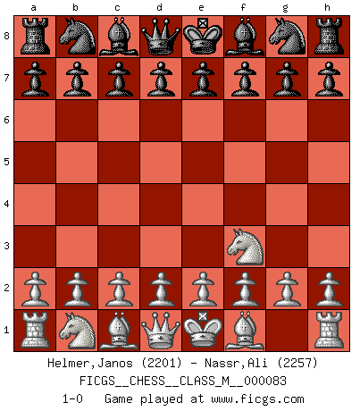 Last move : 1-0 2019 September 15 0:0:45 [Event "FICGS__CHESS__CLASS_M__000083"] [Site "FICGS"] [Date "2019.08.03"] [Round "1"] [White "Helmer,Janos"] [Black "Nassr,Ali"] [Result "1-0"] [WhiteElo "2201"] [BlackElo "2257"] 1.Nf3 1-0 This chess game has been lost on time (started : 2019.08.03 23:33:3) Reti Opening Player White won this chess game. Follow this game move after move (download)When you don't know what to do, wait for your opponent to get an idea - it's sure to be wrong. (Tarrasch) Offensichtlich kennt Kasparow nichts anderes als Schach, und ich könnte 500 weitere Spieler dieser Sorte benennen. (Judith Polgar) Con o sin el título, Bobby Fischer fue sin lugar a dudas el mas grande jugador de su época. (Burt Hochberg) Fischer est le meilleur joueur du monde et Karpov n'est qu'un joueur de bistrot. (Garry Kasparov, agé de 16 ans) You can think I'm wrong, but that's no reason to quit thinking. (Gregory House, House M.D.)