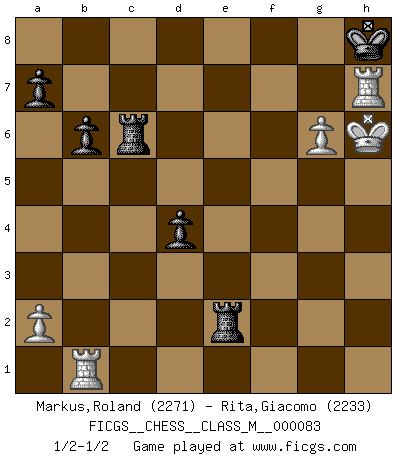 Last move : 1/2-1/2 2019 October 17 12:4:8 [Event "FICGS__CHESS__CLASS_M__000083"] [Site "FICGS"] [Date "2019.08.03"] [Round "1"] [White "Markus,Roland"] [Black "Rita,Giacomo"] [Result "1/2-1/2"] [WhiteElo "2271"] [BlackElo "2233"] 1.d4 Nf6 2.Bf4 d5 3.Nf3 c5 4.e3 Nc6 5.Nbd2 e6 6.c3 Bd6 7.Bg3 O-O 8.Bd3 b6 9.e4 Be7 10.e5 Nh5 11.Ng5 Bxg5 12.Qxh5 g6 13.Qe2 cxd4 14.h4 Bxd2+ 15.Qxd2 dxc3 16.bxc3 d4 17.c4 Qe7 18.Rb1 h5 19.Bf4 Ba6 20.Bg5 Qc5 21.Bf6 Qa5 22.f4 Qxd2+ 23.Kxd2 Rac8 24.g4 Nb8 25.gxh5 Bxc4 26.hxg6 Bxd3 27.Kxd3 Rc3+ 28.Ke4 Rfc8 29.f5 Nd7 30.h5 exf5+ 31.Kxf5 Nxf6 32.Kxf6 R3c6+ 33.Kg5 fxg6 34.hxg6 Re8 35.Rh7 Rxe5+ 36.Kh6 Re2 37.Rg7+ Kh8 38.Rh7+ Kg8 39.Rg7+ Kh8 40.Rh7+ 1/2-1/2 Queen's pawn game Kingside Castling by player Black (move 7) This chess game ended in a draw. Follow this game move after move (download)If one piece is badly posted, the whole game is bad. (Tarrasch) Ich bewundere Kasparows phantasievolle Angriffssiege aus den Achtzigern und Neunzigern, aber wenn man sie mit dem Computer überprüft, nimmt der Computer in jeder zweiten Partie die Opfer an, verteidigt sich und gewinnt. (Vladimir Kramnik) El Rey es una pieza de pelea. ¡Usenlo!. (Wilhelm Steinitz) Un journaliste : 'Vous préférez avoir une dame de plus sur l'échiquier ou au lit ?' Boris Spassky : 'Ca dépend de la position.' A good teacher is like a candle - it consumes itself to light the way for others. (Author unknown)