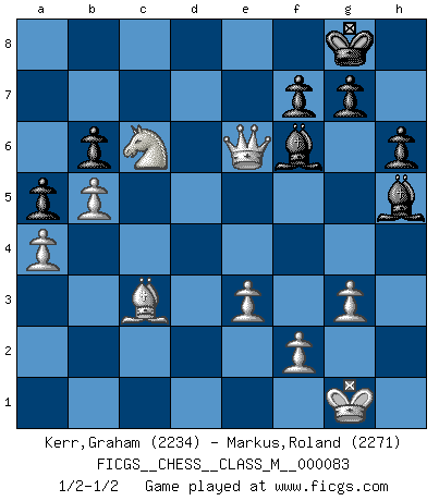 Last move : 1/2-1/2 2020 May 8 11:23:44 [Event "FICGS__CHESS__CLASS_M__000083"] [Site "FICGS"] [Date "2019.08.03"] [Round "1"] [White "Kerr,Graham"] [Black "Markus,Roland"] [Result "1/2-1/2"] [WhiteElo "2234"] [BlackElo "2271"] 1.d4 Nf6 2.c4 e6 3.Nf3 d5 4.g3 Bb4+ 5.Bd2 Be7 6.Bg2 c6 7.O-O O-O 8.Qb3 b6 9.cxd5 cxd5 10.Ne5 Nfd7 11.Nf3 Nc6 12.Rc1 Bb7 13.Nc3 h6 14.a3 Nf6 15.Qd1 Qd7 16.e3 Ne4 17.Rab1 Nd6 18.Be1 Rfc8 19.Bf1 Qe8 20.h4 Bf8 21.Nb5 Nc4 22.a4 a6 23.Nc3 Nd6 24.Ne2 Be7 25.b4 Nc4 26.Nf4 Bd6 27.Bc3 a5 28.b5 Nb4 29.Qb3 Rc7 30.h5 Rac8 31.Be2 e5 32.dxe5 Nxe5 33.Nd4 Rc5 34.Bf1 Rc4 35.Bb2 Nc2 36.Rxc2 Rxc2 37.Nxc2 Nf3+ 38.Kh1 Bxf4 39.Bg2 Nd2 40.Qd3 Ne4 41.Kg1 Be5 42.Nd4 Bf6 43.Rc1 Rxc1+ 44.Bxc1 Bc8 45.Bf3 Bd7 46.Bd2 Qc8 47.Bxe4 dxe4 48.Qxe4 Bg4 49.Bc3 Bxh5 50.Nc6 Qe6 51.Qxe6 1/2-1/2 Queen's pawn game Kingside Castling by player White (move 7) Kingside Castling by player Black (move 7) This chess game ended in a draw. Follow this game move after move (download)With or without the title, Bobby Fischer was unquestionably the greatest player of his time. (Burt Hochberg) Schach ist eine Sache der genauen Beurteilung, wann man zuschlagen und wann man sich ducken muss. (Robert James Fischer) El Ajedrez, como la música, como el amor, tiene el poder de hacer feliz a la gente. (Siegbert Tarrasch) Toutes les manuvres exécutées sur une colonne ouverte ont pour but ultime l'intrusion définitive sur la septième ou la huitième rangée, en plein cur de la position ennemie. (Aaron Nimzovitch) Wisdom doesn't necessarily come with age. Sometimes age just shows up all by itself. (Tom Watson)