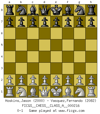 Last move : 0-1 2019 September 14 9:2:56 [Event "FICGS__CHESS__CLASS_A__000216"] [Site "FICGS"] [Date "2019.08.05"] [Round "1"] [White "Hoskins,Jason"] [Black "Vasquez,Fernando"] [Result "0-1"] [WhiteElo "2000"] [BlackElo "2082"] 0-1 This chess game has been lost on time (started : 2019.08.05 6:55:34) Player Black won this chess game. Follow this game move after move (download)There are two classes of men; those who are content to yield to circumstances and who play whist; those who aim to control circumstances, and who play Chess. (Mortimer Collins) Sie führen leise Selbstgespräche, schlürfen lautstark ihre Getränke, schmatzen hörbar beim Essen, blasen ihrem Gegenüber Rauch in die Augen, niesen ihm ins Gesicht, starren ihn unverwandt an, bis er sich unter ihren Blicken windet, rutschen ständig auf ihrem Stuhl hin und her, rülpsen und bohren in der Nase. (Anonymous) Dios mío, Bobby Fischer juega tan simple. (Alexei Suetin) Les Echecs mettent en conflit, non pas deux intelligences, mais deux volontés. (Lasker) Memory is a crazy woman that hoards colored rags and throws away food. (Austin O'Malley)