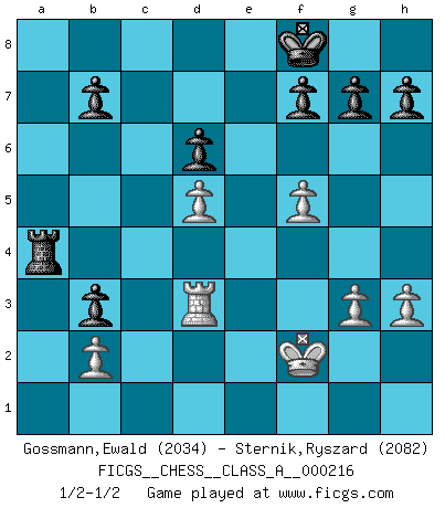 Last move : 1/2-1/2 2019 September 7 22:4:41 [Event "FICGS__CHESS__CLASS_A__000216"] [Site "FICGS"] [Date "2019.08.05"] [Round "1"] [White "Gossmann,Ewald"] [Black "Sternik,Ryszard"] [Result "1/2-1/2"] [WhiteElo "2034"] [BlackElo "2082"] 1.e4 c5 2.Nf3 d6 3.d4 cxd4 4.Nxd4 Nf6 5.Nc3 a6 6.Bd3 e5 7.Nde2 Be6 8.f4 Be7 9.O-O O-O 10.f5 Bd7 11.Nd5 Nxd5 12.exd5 Bb5 13.c4 e4 14.cxb5 exd3 15.Nc3 axb5 16.Qxd3 b4 17.Ne4 Nd7 18.Be3 Nf6 19.Bd4 Nxe4 20.Qxe4 Re8 21.Rfe1 Bg5 22.Qxe8+ Qxe8 23.Rxe8+ Rxe8 24.g3 Re2 25.Rd1 Kf8 26.h3 b3 27.a4 Be3+ 28.Bxe3 Rxe3 29.Kf2 Re4 30.Rd3 Rxa4 1/2-1/2 Sicilian : Najdorf Kingside Castling by player White (move 9) Kingside Castling by player Black (move 9) This chess game ended in a draw. Follow this game move after move (download)I look one move ahead... the best ! (Siegbert Tarrasch) Sicherlich können nur Meister einen Stil haben. Daß ein nicht-Meister auch nur ein einziges Mal in seinem Leben eine Partie folgerecht durchführte, habe ich niemals bemerkt. (Emanuel Lasker) Personalmente, yo prefiero mirar hacia el futuro en donde un programa de computadora gane el título mundial de Ajedrez. La humanidad necesita una lección de humildad. (Richard Dawkings) On est toujours la mazette de quelqu'un d'autre. (Anonyme) Patience, use the Force, think ! (Obi-Wan Kenobi in Star Wars ep.2)