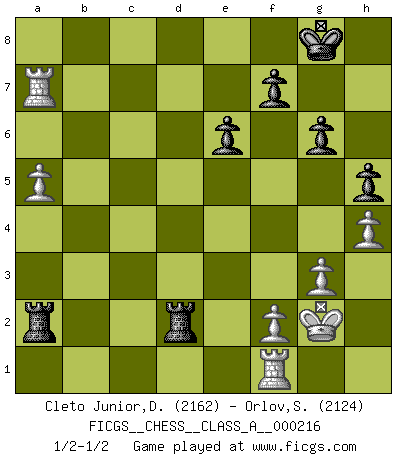 Last move : 1/2-1/2 2019 August 25 9:14:2 [Event "FICGS__CHESS__CLASS_A__000216"] [Site "FICGS"] [Date "2019.08.05"] [Round "1"] [White "Cleto Junior,Dirceu"] [Black "Orlov,Vladimir"] [Result "1/2-1/2"] [WhiteElo "2162"] [BlackElo "2124"] 1.d4 Nf6 2.c4 e6 3.g3 d5 4.Nf3 Be7 5.Bg2 O-O 6.O-O dxc4 7.Qc2 a6 8.a4 Bd7 9.Qxc4 Bc6 10.Bf4 Bd6 11.Bg5 Nbd7 12.Nc3 h6 13.Bxf6 Nxf6 14.a5 Qe7 15.Nh4 Bxg2 16.Kxg2 Rfd8 17.e4 Bb4 18.e5 Nd5 19.Nf5 Qf8 20.Ne3 Bxc3 21.bxc3 c5 22.Rac1 Qe7 23.Qb3 Nxc3 24.dxc5 Ne2 25.Rcd1 Qxc5 26.Qc4 Qxc4 27.Nxc4 Nd4 28.h4 h5 29.Rb1 Nb5 30.Nd6 Nxd6 31.exd6 Rxd6 32.Rxb7 Rc8 33.Ra1 Rc2 34.Rb6 R6d2 35.Rf1 Ra2 36.Rxa6 g6 37.Ra7 1/2-1/2 Catalan Opening Kingside Castling by player Black (move 5) Kingside Castling by player White (move 6) This chess game ended in a draw. Follow this game move after move (download)During a Chess competition a Chessmaster should be a combination of a beast of prey and a monk. (Alexander Alekhine) Ich verachte Kasparow. (Viktor Kortschnoi) Cuando no sepas que mover, espera por una idea que se le venga a la la cabeza de tu oponente. Tenlo por seguro de que esa idea estará incorrecta. (Siegbert Tarrasch) Ce qui caractérise les parties de combat, c'est que si le défenseur a constamment de difficiles problèmes à résoudre, l'attaquant doit chercher sans relâche de nouvelles possibilités d'attaque. (Koblentz) The next best thing to gambling and winning is gambling and loosing. (Nick Dandalos)