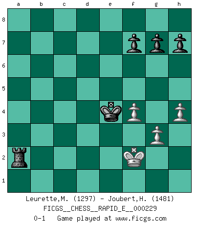 Last move : 0-1 2019 August 29 10:32:23 [Event "FICGS__CHESS__RAPID_E__000229"] [Site "FICGS"] [Date "2019.08.05"] [Round "1"] [White "Leurette,Marc-Antoine"] [Black "Joubert,Hennie"] [Result "0-1"] [WhiteElo "1297"] [BlackElo "1481"] 1.e4 c5 2.d4 cxd4 3.c3 dxc3 4.Nxc3 Nc6 5.Nf3 e6 6.Bb5 Nge7 7.Bxc6 Nxc6 8.O-O d6 9.Re1 Be7 10.e5 dxe5 11.Nxe5 Qxd1 12.Nxd1 Nxe5 13.Rxe5 Bf6 14.Re1 b6 15.Be3 Bb7 16.Nc3 Rc8 17.Rac1 Ke7 18.Nb5 a6 19.Rxc8 Rxc8 20.Na7 Rc2 21.Bxb6 Rxb2 22.Bc5+ Ke8 23.a3 Ra2 24.Rd1 Be7 25.Bxe7 Kxe7 26.Rb1 Bd5 27.Nc8+ Kf6 28.Nb6 Rxa3 29.Nxd5+ exd5 30.Kf1 d4 31.Ke2 a5 32.Kd2 a4 33.g3 Ra2+ 34.Ke1 a3 35.Rd1 Rb2 36.Rxd4 a2 37.Ra4 Rb1+ 38.Ke2 a1Q 39.Rxa1 Rxa1 40.h4 Ke5 41.f4+ Ke4 42.Kf2 Ra2+ 0-1 Sicilian : Smith-Morra gambit Kingside Castling by player White (move 8) Promotion Queen by player Black (move 38) 10 pieces endgame at move 39 : White KRPPP , Black KRPPP WHITE : King + 1 Rook 3 Pawns BLACK : King + 1 Rook 3 Pawns 9 pieces endgame at move 39 : White KPPP , Black KRPPP WHITE : King + 3 Pawns BLACK : King + 1 Rook 3 Pawns Player Black won this chess game. Follow this game move after move (download)Later, I began to succeed in decisive games. Perhaps because I realized a very simple truth: not only was I worried, but also my opponent. (Mikhail Tal) Es liegt in der Natur, vernüftig zu denken und unlogisch zu handeln. (Anatole France) El Ajedrez es un invernadero donde los frutos del carácter pueden madurar mas completamente que en la vida. (Edward Morgan Foster) Si rien de grave n'est détecté lors de l'analyse d'une position, on joue alors le coup. Seconde règle de Blumenfeld. Perfection is achieved, not when there is nothing more to add, but when there is nothing left to take away. (Antoine de Saint-Exupéry)