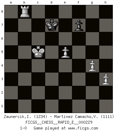Last move : 1-0 2019 October 14 18:25:51 [Event "FICGS__CHESS__RAPID_E__000229"] [Site "FICGS"] [Date "2019.08.05"] [Round "1"] [White "Zaunercik,Ilmar"] [Black "Martinez Camacho,Victor Hugo"] [Result "1-0"] [WhiteElo "1234"] [BlackElo "1111"] 1.e4 e5 2.Nf3 Nc6 3.Bb5 a6 4.Ba4 Nf6 5.d3 b5 6.Bb3 h6 7.c3 Bc5 8.O-O O-O 9.Nbd2 d6 10.Re1 Ng4 11.Re2 Nxf2 12.Rxf2 Bxf2+ 13.Kxf2 Bg4 14.h3 Be6 15.d4 exd4 16.Nxd4 Nxd4 17.cxd4 Qf6+ 18.Qf3 Qxd4+ 19.Qe3 Qxe3+ 20.Kxe3 Bd7 21.a4 bxa4 22.Bxa4 Bxa4 23.Rxa4 Rfe8 24.Kd3 Re6 25.Nc4 Rg6 26.g4 Re6 27.Ne3 Rb8 28.Nd5 c6 29.Nf4 Re7 30.Rxa6 Rc8 31.b4 c5 32.Nd5 Re6 33.Bf4 c4+ 34.Kd4 g5 35.Bxd6 Rd8 36.e5 Rc8 37.Ne7+ Rxe7 38.Bxe7 c3 39.Rxh6 Rc7 40.Bxg5 c2 41.b5 c1Q 42.Bxc1 Rxc1 43.Rc6 Rb1 44.b6 Kg7 45.Kc5 Kf8 46.Rc7 Ke8 47.b7 Rb3 48.Rc8+ Kd7 49.b8Q Rxb8 50.Rxb8 1-0 Ruy Lopez : Anderssen variation Kingside Castling by player White (move 8) Kingside Castling by player Black (move 8) Promotion Queen by player Black (move 41) 10 pieces endgame at move 42 : White KRBPPPP , Black KRP WHITE : King + 1 Rook 1 Bishop 4 Pawns BLACK : King + 1 Rook 1 Pawn 9 pieces endgame at move 42 : White KRPPPP , Black KRP WHITE : King + 1 Rook 4 Pawns BLACK : King + 1 Rook 1 Pawn Promotion Queen by player White (move 49) 8 pieces endgame at move 49 : White KRPPP , Black KRP WHITE : King + 1 Rook 3 Pawns BLACK : King + 1 Rook 1 Pawn 7 pieces endgame at move 50 : White KRPPP , Black KP WHITE : King + 1 Rook 3 Pawns BLACK : King + 1 Pawn Player White won this chess game. Follow this game move after move (download)There just isn't enough televised Chess. (David Letterman) Drei Punkte vor allen anderen ist wie einer, der im weißen Anzug posiert, während der Rest in Müllsäcke gekleidet dasteht. (Viktor Kortschnoi) En el Ajedrez, tal como es jugado por los Maestros, practicamente la suerte es eliminada. (Emanuel Lasker) Il n'y a pas eu de défaite parce que je ne crois pas que cet ordinateur ait jamais existé. IBM a triché en refusant d'imprimer les modes de recherche de la machine. C'est évident, pendant le match, des coups décisifs ont été joués par des êtres humains. Aujourd'hui, les meilleurs spécialistes en informatique ne peuvent toujours pas expliquer comment Deep-Blue a pu jouer contre la logique des ordinateurs. IBM a gagné une guerre de communication, mais ils sont incapables de prouver que l'ordinateur a gagné tout seul. (Garry Kasparov) If you ain't just a little scared when you enter a casino, you are either very rich or you haven't studied the games enough. (Pappy)