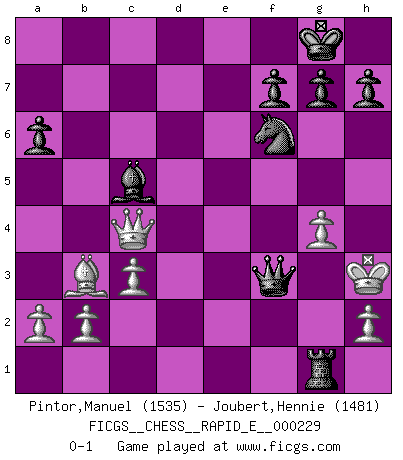 Last move : 0-1 2019 August 26 18:0:28 [Event "FICGS__CHESS__RAPID_E__000229"] [Site "FICGS"] [Date "2019.08.05"] [Round "1"] [White "Pintor,Manuel"] [Black "Joubert,Hennie"] [Result "0-1"] [WhiteElo "1535"] [BlackElo "1481"] 1.e4 c5 2.f4 e6 3.Nf3 Nc6 4.Bc4 d5 5.exd5 exd5 6.Bb5 Nf6 7.Ne5 Bd7 8.Nxd7 Qxd7 9.O-O Be7 10.d3 O-O 11.Nc3 a6 12.Ba4 b5 13.Bb3 c4 14.Nxd5 Nxd5 15.dxc4 bxc4 16.Bxc4 Nf6 17.Be3 Rad8 18.Qf3 Nb4 19.Rad1 Qc7 20.Bb3 Rxd1 21.Qxd1 Rd8 22.Qe2 Bc5 23.c3 Re8 24.Rf3 Nbd5 25.Kf1 Nxe3+ 26.Rxe3 Rxe3 27.Qc4 Qe7 28.g3 Re1+ 29.Kg2 Rg1+ 30.Kh3 Qd7+ 31.f5 Qxf5+ 32.g4 Qf3+ 0-1 Sicilian : Grand Prix attack Kingside Castling by player White (move 9) Kingside Castling by player Black (move 10) Player Black won this chess game. Follow this game move after move (download)When you see a good move, look for a better one. (Emanuel Lasker) Es gibt zwei Arten von Opfern: Korrekte und meine. (Mikhail Nekhemyevich Tal) Todos los jugadores de Ajedrez deberían tener un pasatiempo. (Savielly Tartakower) Les réformistes prétendent que les progrès de la théorie conduiront à la disparition des échecs, et qu'il faut, pour leur rendre vie, en remanier les règles. En réalité, qu'exprime cette affirmation? Le mépris de l'intuition, de l'imagination et de tous les autres éléments qui font des échecs un art. (Alexander Alekhine) Patience, use the Force, think ! (Obi-Wan Kenobi in Star Wars ep.2)