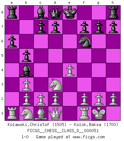 Last move : 1-0 2007 August 9 14:49:22 [Event "FICGS__CHESS__CLASS_D__000051"] [Site "FICGS"] [Date "2007.06.19"] [Round "1"] [White "Kolawski,Christof"] [Black "Kolok,Baksa"] [Result "1-0"] [WhiteElo "1505"] [BlackElo "1700"] 1.e4 e5 2.Nf3 Nc6 3.Bb5 a6 4.Ba4 b5 5.Bb3 Na5 6.O-O Nxb3 7.axb3 Bb4 8.Nxe5 Nf6 9.Nd3 1-0 This chess game has been lost on time (started : 2007.06.19 22:1:5) Ruy Lopez : Taimanov (chase/wing/Accelerated counterthrust) variation Kingside Castling by player White (move 6) Player White won this chess game. Follow this game move after move (download)You may learn much more from a game you lose than from a game you win. You will have to lose hundreds of games before becoming a good player. (Jose Raul Capablanca) Konzentriere dich auf materielle Gewinne. Nimm, was dir dein Gegner gibt, ausser es gibt einen guten Grund der dagegenspricht. (Robert James Fischer) Existen dos clases de sacrificios: los correctos y los míos. (Mikhail Tal) Vous savez, camarade Pachman, je n'éprouve pas de plaisir à être ministre, je jouerais plutôt aux échecs comme vous, ou alors ferais une révolution au Venezuela. (Che Guevara à Ludek Pachman, 'Checkmate in Prague', 1975) God, you are such an idiot. - Actually, I thought I was more of a jerk. (Gregory House to Stacy Warner, House M.D.)