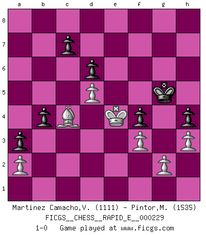 Last move : 1-0 2019 October 31 18:59:18 [Event "FICGS__CHESS__RAPID_E__000229"] [Site "FICGS"] [Date "2019.08.05"] [Round "1"] [White "Martinez Camacho,Victor Hugo"] [Black "Pintor,Manuel"] [Result "1-0"] [WhiteElo "1111"] [BlackElo "1535"] 1.e4 e5 2.Nf3 Nc6 3.Bb5 Qf6 4.O-O Bc5 5.d3 h6 6.Nc3 Nge7 7.Re1 O-O 8.Nd5 Nxd5 9.exd5 Nd4 10.Nxd4 Bxd4 11.Qe2 a6 12.Ba4 b5 13.Bb3 d6 14.Be3 Bxb2 15.Rad1 Bc3 16.Rf1 Qg6 17.Qf3 Bg4 18.Qe4 Bxd1 19.Rxd1 f5 20.Qf3 f4 21.Bc1 Rf5 22.Bd2 Bd4 23.c3 Bb6 24.Bc2 Rg5 25.Rc1 Rg4 26.d4 Qg5 27.h3 Rh4 28.Kf1 Rf8 29.Qe4 Rf6 30.Qh7+ Kf8 31.Qh8+ Kf7 32.Qd8 exd4 33.Qd7+ Kg8 34.Qe8+ Rf8 35.Qe6+ Kh8 36.Re1 Qf6 37.Qxf6 gxf6 38.cxd4 Bxd4 39.Re7 Bb6 40.Rh7+ Kg8 41.Re7 Rf7 42.Re8+ Kg7 43.Re4 a5 44.Rxf4 Rxf4 45.Bxf4 a4 46.Bf5 b4 47.Bc2 a3 48.Ke2 Re7+ 49.Kf3 Re1 50.Bd2 Rf1 51.Be3 Bxe3 52.Kxe3 h5 53.Bb3 f5 54.Bc4 Kf6 55.Bxf1 Ke5 56.Bc4 f4+ 57.Kd3 h4 58.Bb3 Kf5 59.Ke2 Ke4 60.f3+ Kf5 61.Kd3 Kf6 62.Ke4 Kg5 63.Bc4 1-0 Ruy Lopez (Spanish Opening) Kingside Castling by player White (move 4) Kingside Castling by player Black (move 7) Player White won this chess game. Follow this game move after move (download)Human affairs are like a Chess game: only those who do not take it seriously can be called good players. (Hung Tzu Ch'eng) Kombinieren und Schwarzhandel gehören verboten. (Savielly Grigorievitsch Tartakower) Una compensación adecuada por un sacrificio es tener una combinación sólida que conduce a una posición ganadora; una compensación adecuada por una metida de pata es dejar a tu oponente arrebatar una derrota de las fauces de la victoria. (Bruce A. Moon) Dieu déplace le joueur, et celui-ci la pièce. Quel Dieu derrière Dieu commence donc la trame ? Arturo Perez-Reverte (prix de littérature policière 1993). First of all, we have to go back to the classical time control. (Anatoly Karpov)