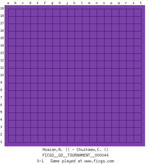 Last move : 0-1 2019 September 5 2:16:21 [Event "FICGS__GO__TOURNAMENT__000044"] [Site "FICGS"] [Date "2019.08.05"] [Round "1"] [Black "Hoaian,Nguyen Hoai Thien An"] [White "Chuikaew,Chumphon"] [Result "0-1"] 0-1 This go game has been lost on time (started : 2019.08.05 22:33:43) Here are the names of the openings (joseki) played in the four corners : Player White won this Go (weiqi, baduk) game. Follow this game move after move (download)Six eyes in a rectangle are alive. (Anonymous) The only sure thing about luck is that it will change. (Wilson Mizner)