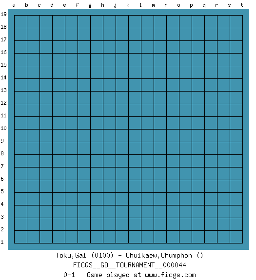 Last move : 0-1 2019 September 5 2:16:21 [Event "FICGS__GO__TOURNAMENT__000044"] [Site "FICGS"] [Date "2019.08.05"] [Round "1"] [Black "Toku,Gai"] [White "Chuikaew,Chumphon"] [Result "0-1"] [Rating 1 "0100"] 0-1 This go game has been lost on time (started : 2019.08.05 22:33:43) Here are the names of the openings (joseki) played in the four corners : Player White won this Go (weiqi, baduk) game. Follow this game move after move (download)Josekis are not fixed, definitive things. They indicate the moments when everything can change. (Pierre Audouard) Macintosh - we might not get everything right, but at least we knew the century was going to end. (Douglas Adams)