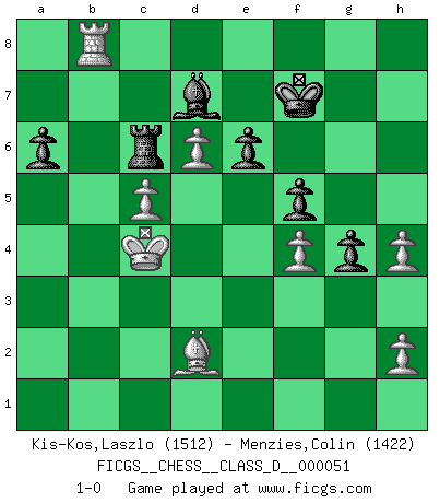 Last move : 1-0 2007 November 20 22:45:18 [Event "FICGS__CHESS__CLASS_D__000051"] [Site "FICGS"] [Date "2007.06.19"] [Round "1"] [White "Kis-Kos,Laszlo"] [Black "Menzies,Colin"] [Result "1-0"] [WhiteElo "1512"] [BlackElo "1422"] 1.e4 e6 2.d4 d5 3.Nc3 Bb4 4.e5 c5 5.a3 cxd4 6.axb4 dxc3 7.Nf3 Qc7 8.Qd4 cxb2 9.Bxb2 Ne7 10.Bd3 Nbc6 11.Qc3 d4 12.Qc5 Nd5 13.Be4 Ndxb4 14.Nxd4 Qe7 15.Qxe7+ Kxe7 16.Ba3 Nxd4 17.Bxb4+ Ke8 18.O-O Nc6 19.Rfb1 f5 20.Bxc6+ bxc6 21.Rd1 Kf7 22.Rd6 Kg6 23.Rxc6 Rd8 24.Rd6 Rxd6 25.exd6 Bd7 26.f4 a6 27.c4 Rc8 28.c5 Rc6 29.Kf2 h6 30.Ke3 Kf7 31.Kd4 g5 32.g3 Kf6 33.Kc4 h5 34.Bc3+ Kg6 35.Bd2 g4 36.Rb1 Kf7 37.Rb8 h4 38.gxh4 1-0 French : Winawer, Advance, Rauzer variation Kingside Castling by player White (move 18) Player White won this chess game. Follow this game move after move (download)Later, I began to succeed in decisive games. Perhaps because I realized a very simple truth: not only was I worried, but also my opponent. (Mikhail Tal) Ich suche im Schach immer etwas Eigenes. Riskantes Spiel im Stile schachlicher Musketiere ist nicht meine Sache, auch wenn es vielen Freunden scharfer Wendungen gefällt. (Anatoly Karpov) Una mala movida nulifica cuarenta buenas. (Horowitz) Karpov est une pièce de musée. (Garry Kasparov) Fear is the path to the dark side. Fear leads to anger; anger leads to hate; hate leads to suffering. I sense much fear in you. (Master Yoda in Star Wars ep.1)