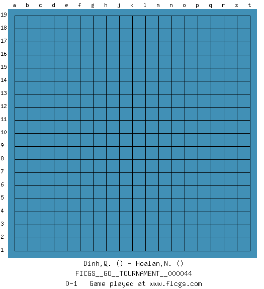 Last move : 0-1 2019 September 5 2:16:21 [Event "FICGS__GO__TOURNAMENT__000044"] [Site "FICGS"] [Date "2019.08.05"] [Round "1"] [Black "Dinh,Quynh Anh"] [White "Hoaian,Nguyen Hoai Thien An"] [Result "0-1"] 0-1 This go game has been lost on time (started : 2019.08.05 22:33:43) Here are the names of the openings (joseki) played in the four corners : Player White won this Go (weiqi, baduk) game. Follow this game move after move (download)Pon-nuki is worth thirty points. (Anonymous) Hardware: the parts of a computer that can be kicked. (Jeff Persis)