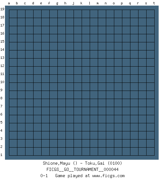 Last move : 0-1 2019 September 5 2:16:21 [Event "FICGS__GO__TOURNAMENT__000044"] [Site "FICGS"] [Date "2019.08.05"] [Round "1"] [Black "Shione,Mayu"] [White "Toku,Gai"] [Result "0-1"] [Rating 2 "0100"] 0-1 This go game has been lost on time (started : 2019.08.05 22:33:43) Here are the names of the openings (joseki) played in the four corners : Player White won this Go (weiqi, baduk) game. Follow this game move after move (download)The comb formation is alive. (Anonymous) Follow your passion, and success will follow you. (Arthur Buddhold)