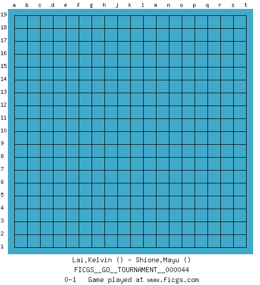 Last move : 0-1 2019 September 5 2:16:21 [Event "FICGS__GO__TOURNAMENT__000044"] [Site "FICGS"] [Date "2019.08.05"] [Round "1"] [Black "Lai,Kelvin"] [White "Shione,Mayu"] [Result "0-1"] 0-1 This go game has been lost on time (started : 2019.08.05 22:33:43) Here are the names of the openings (joseki) played in the four corners : Player White won this Go (weiqi, baduk) game. Follow this game move after move (download)Big groups never die. (Anonymous) Every man's memory is his private literature. (Aldous Huxley)