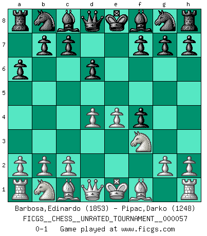 Last move : 0-1 2019 September 17 14:37:40 [Event "FICGS__CHESS__UNRATED_TOURNAMENT__000057"] [Site "FICGS"] [Date "2019.08.07"] [Round "1"] [White "Barbosa,Edinardo"] [Black "Pipac,Darko"] [Result "0-1"] [WhiteElo "1853"] [BlackElo "1248"] 1.e4 e5 2.f4 exf4 3.Nf3 a6 4.d4 d6 0-1 This chess game has been lost on time (started : 2019.08.07 10:37:53) King's knight's gambit Player Black won this chess game. Follow this game move after move (download)War is the child of passion, passion is the child of narcissism and narcissism is the child. (...) Another game ? (Thibault de Vassal) Ich war zu klein für die Schach-Schülermannschaft! (Woody Allen) El Ajedrez es el juego mas altamente simbólico, pero las agresiones estan por lo tanto aún mas francamente representadas en la partida. Tal vez comenzo como un juego de guerra; Algo como la representación de una batalla en miniatura entre las fuerzas de dos reinos. (Karl Meninger) La guerre est enfant de la passion, la passion est enfant du narcissisme et le narcissisme est l'enfant. (...) Une autre partie ? (Thibault de Vassal) The next best thing to gambling and winning is gambling and loosing. (Nick Dandalos)