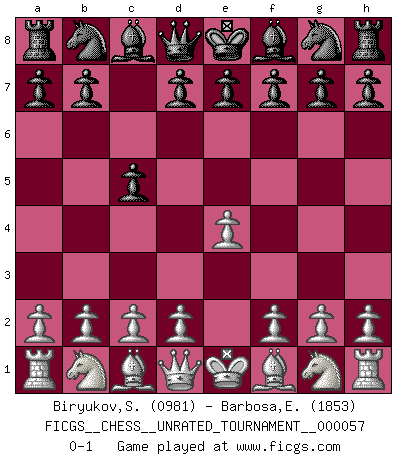 Last move : 0-1 2019 September 29 3:37:37 [Event "FICGS__CHESS__UNRATED_TOURNAMENT__000057"] [Site "FICGS"] [Date "2019.08.07"] [Round "1"] [White "Biryukov,Sergey"] [Black "Barbosa,Edinardo"] [Result "0-1"] [WhiteElo "0981"] [BlackElo "1853"] 1.e4 c5 0-1 This chess game has been lost on time (started : 2019.08.07 10:37:53) Sicilian defense Player Black won this chess game. Follow this game move after move (download)Chess is imagination. (David Bronstein) Zeige mir drei Eröffnungsvarianten und ich beweise dir, dass zwei davon inkorrekt sind. (Emanuel Lasker) Después de una mala apertura, hay una esperanza en el juego medio. Pero una vez que estas en finales, el momento de la verdad ha llegado. (Edmar Mednis) La vie et les Echecs sont tous les deux une lutte constante. (Lasker) In my experience, there's no such thing as luck. (Obi-Wan Kenobi in Star Wars ep.4)