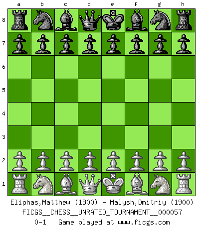 Last move : 0-1 2019 September 16 12:7:41 [Event "FICGS__CHESS__UNRATED_TOURNAMENT__000057"] [Site "FICGS"] [Date "2019.08.07"] [Round "1"] [White "Eliphas,Matthew"] [Black "Malysh,Dmitriy"] [Result "0-1"] [WhiteElo "1800"] [BlackElo "1900"] 0-1 This chess game has been lost on time (started : 2019.08.07 10:37:53) Player Black won this chess game. Follow this game move after move (download)The only thing Chess players have in common is Chess. (Lodewijk Prins) Ich bin Weltmeister und muß mit niemandem irgend etwas diskutieren. (Viswanathan Anand) Por esta medida (el intervalo entre Fischer y sus contemporaneos), yo le considero el mas grande campeón mundial. (Garry Kasparov) Ce n'est pas pour s'amuser qu'il joue aux échecs : il célèbre un culte. (Vladimir Nabokov) Games, world of games... There's always an opponent, and there's always a victim. (Revolver, movie)