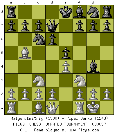 Last move : 0-1 2019 September 18 2:37:13 [Event "FICGS__CHESS__UNRATED_TOURNAMENT__000057"] [Site "FICGS"] [Date "2019.08.07"] [Round "1"] [White "Malysh,Dmitriy"] [Black "Pipac,Darko"] [Result "0-1"] [WhiteElo "1900"] [BlackElo "1248"] 1.e4 e5 2.Nf3 Nc6 3.Bb5 d6 4.O-O Bg4 5.Nc3 Qd7 0-1 This chess game has been lost on time (started : 2019.08.07 10:37:53) Ruy Lopez : Old Steinitz defense Kingside Castling by player White (move 4) Player Black won this chess game. Follow this game move after move (download)Only sissies Castle. (Rob Sillars) Die Neutralität betrachte ich als eine schwere Krankheit. (Viktor Kortschnoi) Debemos de asegurarnos de que el Ajedrez no se convierta en un lenguaje muerto, muy interesante, pero tan solo para un grupo muy pequeño. (Sytze Faber) Mais l'homme est une créature légère et illogique : semblable au joueur d'échecs, il n'aime que le processus du but à atteindre, non le but lui-même. (Dostoïevsky) Always be a first-rate version of yourself, instead of a second-rate version of somebody else. (Judy Garland)
