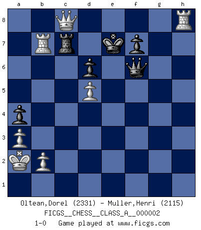 Last move : 1-0 2006 August 26 9:11:52 [Event "FICGS__CHESS__CLASS_A__000002"] [Site "FICGS"] [Date "2006.04.10"] [Round "1"] [White "Oltean,Dorel"] [Black "Muller,Henri"] [Result "1-0"] [WhiteElo "2331"] [BlackElo "2115"] 1.e4 c5 2.Nf3 d6 3.d4 cxd4 4.Nxd4 Nf6 5.Nc3 a6 6.Be3 e5 7.Nb3 Be6 8.f3 Be7 9.Qd2 O-O 10.O-O-O Nbd7 11.g4 Qc7 12.Kb1 Rfc8 13.g5 Nh5 14.Nd5 Bxd5 15.exd5 a5 16.a3 a4 17.Nc1 Nb6 18.Rg1 g6 19.Na2 Nc4 20.Bxc4 Qxc4 21.Rg4 Qc7 22.Nc3 Qd7 23.Qd3 Ng7 24.Rb4 Nf5 25.h4 Bd8 26.Ne4 Kg7 27.Bf2 Rab8 28.f4 exf4 29.Rf1 Kg8 30.Ba7 Ra8 31.Bd4 Nxd4 32.Qxd4 Be7 33.h5 gxh5 34.Rxf4 Rc7 35.Qg1 Qd8 36.Rh4 Rac8 37.Rxh5 Rxc2 38.Nf6+ Kf8 39.Nxh7+ Ke8 40.Qe3 Rc1+ 41.Ka2 Kd7 42.Rxb7+ R1c7 43.Qh3+ Ke8 44.Nf6+ Bxf6 45.gxf6 Qxf6 46.Rh8+ Ke7 47.Qxc8 1-0 Sicilian : Najdorf, Byrne (English) attack Kingside Castling by player Black (move 9) Queenside Castling by player White (move 10) Player White won this chess game. Follow this game move after move (download)I love all positions. Give me a difficult positional game, I will play it. But totally won positions, I cannot stand them. (Hein Donner) Kritik überlasse ich den Spießern. Ich zeige nichts, wofür ich mich schämen muss. (Alexandra Kosteniuk) Alguna parte de un error es siempre correcto. (Savielly Tartakover) Les écrivains ont utilisé les échecs pour analyser les côtés extrêmes de la nature humaine. Dans ce cadre, les échecs offrent un champ d'expérimentation idéal. Mais on pourrait faire la même chose avec la peinture. Et là, en vous référant à Van Gogh, vous ne tirerez pas de conclusion définitive sur les peintres. (Gary Kasparov) A shortcut is the longest distance between two points. (Don Groves)