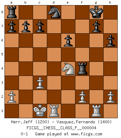 Last move : 0-1 2006 August 1 1:52:43 [Event "FICGS__CHESS__CLASS_F__000004"] [Site "FICGS"] [Date "2006.06.18"] [Round "1"] [White "Herr,Jeff"] [Black "Vasquez,Fernando"] [Result "0-1"] [WhiteElo "1200"] [BlackElo "1400"] 1.d4 d5 2.c4 dxc4 3.e3 e5 4.Bxc4 exd4 5.Qf3 Nf6 6.exd4 Bb4+ 7.Bd2 Qxd4 8.Qe2+ Be7 9.Bc3 Qe4 10.Nd2 Qxg2 11.Qf3 Qxf3 12.Ngxf3 O-O 13.O-O-O Nc6 14.Rhg1 Be6 15.Bxe6 fxe6 16.Ng5 Nd8 17.Nde4 h6 18.Nxf6+ Bxf6 19.Ne4 Bxc3 20.bxc3 Rf4 0-1 Queen's gambit accepted Kingside Castling by player Black (move 12) Queenside Castling by player White (move 13) Player Black won this chess game. Follow this game move after move (download)The King is a fighting piece. Use it ! (Wilhelm Steinitz) Ein Teil des Fehlers ist immer korrekt. (Savielly Grigorievitsch Tartakower) Si tu oponente te ofrece un empate, trata de averiguar porque piensa él que esta en una posición peor. (Nigel Short) Dieu déplace le joueur, et celui-ci la pièce. Quel Dieu derrière Dieu commence donc la trame ? Arturo Perez-Reverte (prix de littérature policière 1993). No, I am still playing. (Anatoly Karpov)