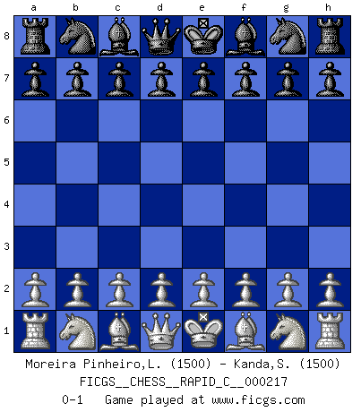 Last move : 0-1 2019 September 6 17:1:55 [Event "FICGS__CHESS__RAPID_C__000217"] [Site "FICGS"] [Date "2019.08.07"] [Round "1"] [White "Moreira Pinheiro,Luan"] [Black "Kanda,Somas"] [Result "0-1"] [WhiteElo "1500"] [BlackElo "1500"] 0-1 This chess game has been lost on time (started : 2019.08.07 10:52:34) Player Black won this chess game. Follow this game move after move (download)In life, as in Chess, one's own Pawns block one's way. A man's very wealth, ease, leisure, children, books, which should help him to win, more often checkmate him. (Charles Buxton) Im Internet Chess Club betrug mein Rating vorübergehend 3350 ELO-Punkte. (Sergej Karjakin) Juega la Apertura como un libro, el Juego Medio como un mago y los Finales como una máquina. (Spielmann) Je menace de comprendre la position. (Anonyme) Kids, you tried your best and you failed miserably. The lesson is, never try. (Simpsons)