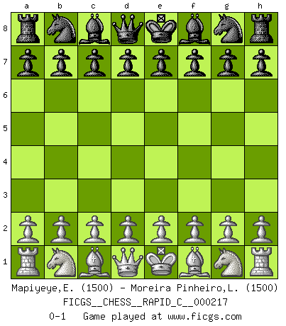 Last move : 0-1 2019 September 6 17:1:55 [Event "FICGS__CHESS__RAPID_C__000217"] [Site "FICGS"] [Date "2019.08.07"] [Round "1"] [White "Mapiyeye,Edward"] [Black "Moreira Pinheiro,Luan"] [Result "0-1"] [WhiteElo "1500"] [BlackElo "1500"] 0-1 This chess game has been lost on time (started : 2019.08.07 10:52:34) Player Black won this chess game. Follow this game move after move (download)A strong memory, concentration, imagination, and a strong will is required to become a great Chess player. (Bobby Fischer) Sie bekommen vielleicht den Eindruck, dass die Spitzenspieler überhaupt gar nicht so stark sind. Aber das stimmt nicht. Es ist eine Illusion. Mit einem Computer an der Seite ist es sehr leicht, Urteile zu fällen, aber wenn man alleine am Brett sitzt, sieht die Sache ganz anders aus. (Vladimir Kramnik) Bobby es el jugador de Ajedrez mas fino que este país jamás haya producido. Su memoria para las movidas, su brillantez en soñar combinaciones y su feróz determinación por la victoria son algo extraño. (John Collins) Les erreurs sont comme les malheurs, elles n'arrivent jamais seules. (Siegbert Tarrasch) Computers have lots of memory but no imagination. (Anonymous)
