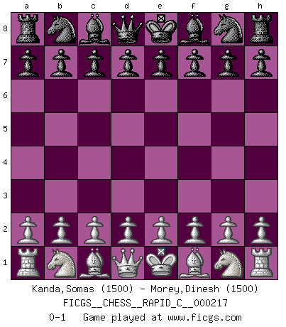 Last move : 0-1 2019 September 6 17:1:55 [Event "FICGS__CHESS__RAPID_C__000217"] [Site "FICGS"] [Date "2019.08.07"] [Round "1"] [White "Kanda,Somas"] [Black "Morey,Dinesh"] [Result "0-1"] [WhiteElo "1500"] [BlackElo "1500"] 0-1 This chess game has been lost on time (started : 2019.08.07 10:52:34) Player Black won this chess game. Follow this game move after move (download)Chess is life. (Bobby Fischer) Je älter ich werde, um so mehr schätze ich die Bauern. (Paul Keres) Una de estas pequeñas movidas modestas pudieran ser mas molestas a tu oponente que la amenaza mas grande. (Siegbert Tarrasch) RxDa4 pat (...) Wisdom is the reward you get for a lifetime of listening when you'd have preferred to talk. (Doug Larson)