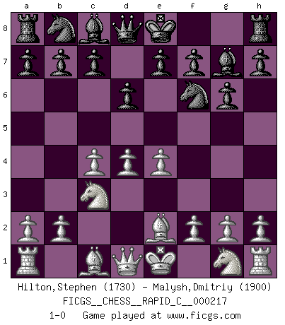Last move : 1-0 2019 September 11 9:54:40 [Event "FICGS__CHESS__RAPID_C__000217"] [Site "FICGS"] [Date "2019.08.07"] [Round "1"] [White "Hilton,Stephen"] [Black "Malysh,Dmitriy"] [Result "1-0"] [WhiteElo "1730"] [BlackElo "1900"] 1.d4 Nf6 2.c4 g6 3.Nc3 Bg7 4.e4 d6 5.Be2 1-0 This chess game has been lost on time (started : 2019.08.07 10:52:34) King's Indian : 5.Be2 Player White won this chess game. Follow this game move after move (download)A Chess game is a dialogue, a conversation between a player and his opponent. Each move by the opponent may contain threats or be a blunder, but a player cannot defend against threats or take advantage of blunders if he does not first ask himself: What is my opponent planning after each move ? (Bruce A. Moon) Ich moechte nie einem Club beitreten, der Leute wie mich als Mitglieder aufnimmt. (Woody Allen) Cuando veas una buena jugada, trata de encontrar otra mejor. (Emanuel Lasker) Votre prénom est 'Tactique', votre deuxième prénom est 'Tactique' et votre nom est 'Tactique'. (Ken Smith) I teach you to lie, cheat and steal, and as soon as my back's turned you wait in line ? (Gregory House, House M.D.)