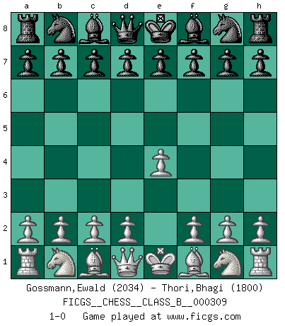 Last move : 1-0 2019 September 18 14:53:47 [Event "FICGS__CHESS__CLASS_B__000309"] [Site "FICGS"] [Date "2019.08.08"] [Round "1"] [White "Gossmann,Ewald"] [Black "Thori,Bhagi"] [Result "1-0"] [WhiteElo "2034"] [BlackElo "1800"] 1.e4 1-0 This chess game has been lost on time (started : 2019.08.08 1:34:18) King's pawn Opening Player White won this chess game. Follow this game move after move (download)The most powerful weapon in Chess is to have the next move. (David Bronstein) Warum muß ich gegen diesen IDIOTEN verlieren? (Aaron Nimzowitsch) Si el Ajedrez es una ciencia, es la mas inexacta. Si el Ajedrez es un arte, es demasiado inexacto para ser visto como tal. Si el Ajedrez es un deporte, es demasiado esotérico. Si el Ajedrez es un juego, es demasiado exigente para ser solo un juego. Si el Ajedrez es una aventura, es una muy demandante. Si el Ajedrez es una pasión, es una muy gratificante. Si el Ajedrez es la vida, es una muy triste. (Anónimo) Que feriez-vous si vous étiez en train de jouer aux échecs et que la fin du monde arrive ? Je continuerais à jouer. (Saint Borromée) Think like a man of action, act like a man of thought. (Henri Louis Bergson)