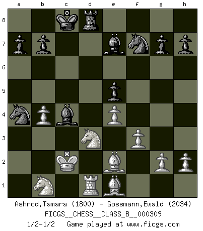 Last move : 1/2-1/2 2019 August 21 23:14:29 [Event "FICGS__CHESS__CLASS_B__000309"] [Site "FICGS"] [Date "2019.08.08"] [Round "1"] [White "Ashrod,Tamara"] [Black "Gossmann,Ewald"] [Result "1/2-1/2"] [WhiteElo "1800"] [BlackElo "2034"] 1.a3 e5 2.e3 d5 3.c4 d4 4.Nf3 dxe3 5.dxe3 Qxd1+ 6.Kxd1 f6 7.Nc3 c6 8.b3 Nh6 9.Ne1 Be6 10.Kc2 Nd7 11.Nd3 Be7 12.Be2 f5 13.Bb2 O-O-O 14.Rad1 Nf7 15.Rhe1 Rhf8 16.e4 Ng5 17.f3 f4 18.Nb1 Nf7 19.b4 Bh4 20.Rf1 Bxc4 21.Nxf4 Nb6 22.Rxd8+ Rxd8 23.Nd3 c5 24.Rd1 Be7 25.Bc3 cxb4 26.axb4 Na4 27.Be1 1/2-1/2 Anderssen's Opening Queenside Castling by player Black (move 13) This chess game ended in a draw. Follow this game move after move (download)Pawns: they are the soul of this game, they alone form the attack and defense. (Philidor) Glücklicherweise sind Großmeister Ruben Fines reine Schachbücher weniger phallozentrisch [als seine Schachpsychologie] und deswegen auch weniger lächerlich. (Nigel Short) Yo nunca en mi vida he jugado la Defensa Francesa, que viene siendo la más aburrida de todas las Aperturas. (Wilhelm Steinitz) Les Echecs représentent une sphère d'idées créatrices basée sur la volonté des deux protagonistes. (Smyslov) No man has ever achieved immortality in his own life time. (Unknown)