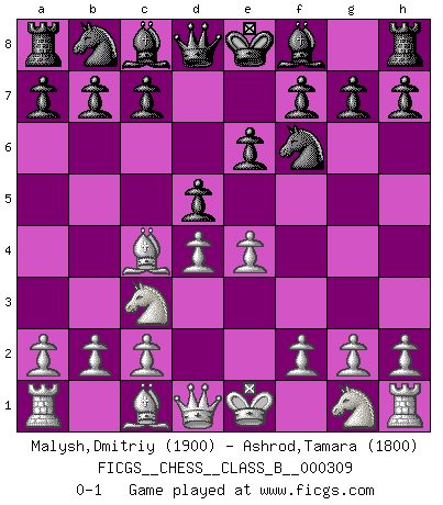 Last move : 0-1 2019 September 17 14:37:40 [Event "FICGS__CHESS__CLASS_B__000309"] [Site "FICGS"] [Date "2019.08.08"] [Round "1"] [White "Malysh,Dmitriy"] [Black "Ashrod,Tamara"] [Result "0-1"] [WhiteElo "1900"] [BlackElo "1800"] 1.e4 d6 2.d4 Nf6 3.Nc3 e6 4.Bc4 d5 0-1 This chess game has been lost on time (started : 2019.08.08 1:34:18) Pirc defense Player Black won this chess game. Follow this game move after move (download)There is only one thing Fischer does in Chess without pleasure: to lose ! (Boris Spassky) Im Internet Chess Club betrug mein Rating vorübergehend 3350 ELO-Punkte. (Sergej Karjakin) Alguna parte de un error es siempre correcto. (Savielly Tartakover) Lorsque vous vous retrouvez devant une position atroce, ne tendez pas un ultime piège dérisoire avec l'intention d'abandonner si l'adversaire le déjoue ! Faites-vous plutôt un devoir de résister comme si votre vie en dépendait. Jouez le coup qui vous déplairait au centuple si vous étiez dans la peau de votre tortionnaire ! Now be brave and don't look back. Don't look back. (Shmi Skywalker in Star Wars ep.1)