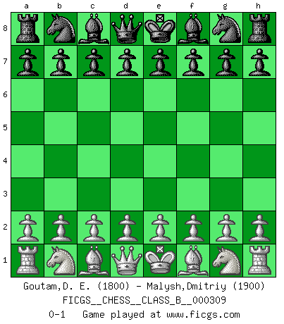 Last move : 0-1 2019 September 17 1:52:38 [Event "FICGS__CHESS__CLASS_B__000309"] [Site "FICGS"] [Date "2019.08.08"] [Round "1"] [White "Goutam,D. E."] [Black "Malysh,Dmitriy"] [Result "0-1"] [WhiteElo "1800"] [BlackElo "1900"] 0-1 This chess game has been lost on time (started : 2019.08.08 1:34:18) Player Black won this chess game. Follow this game move after move (download)Fischer is completely natural. He plays no roles. He's like a child. Very, very simple. (Zita Rajcsanyi) Wenn ich Weiß habe gewinne ich weil ich Weiß habe, wenn ich Schwarz habe gewinne ich weil ich Bogoljubov bin. (Efim Bogoljubov) En el tablero, la mentira e hipocresía no sobreviven mucho. (Emanuel Lasker) Les échecs, c'est l'imagination. (David Bronstein) To err is human, to shift the blame on someone else is tactical. (Mladen Jankovic)