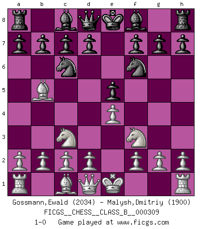 Last move : 1-0 2019 September 19 5:30:14 [Event "FICGS__CHESS__CLASS_B__000309"] [Site "FICGS"] [Date "2019.08.08"] [Round "1"] [White "Gossmann,Ewald"] [Black "Malysh,Dmitriy"] [Result "1-0"] [WhiteElo "2034"] [BlackElo "1900"] 1.e4 e5 2.Nf3 Nf6 3.Nc3 Nc6 4.Bb5 1-0 This chess game has been lost on time (started : 2019.08.08 1:34:18) Petrov Three knights game Player White won this chess game. Follow this game move after move (download)You are for me the Queen on d8 and I am the Pawn on d7 !! (Eduard Gufeld) Charakterschwächen offenbaren sich normalerweise während einer Schachpartie. (Garry Kasparov) La vida es como el Ajedrez, con lucha, competición y eventos buenos y malos. (Benjamin Franklin) Fischer est le meilleur joueur du monde et Karpov n'est qu'un joueur de bistrot. (Garry Kasparov, agé de 16 ans) Knowledge rests not upon truth alone, but upon error also. (Carl G. Jung)