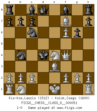 Last move : 1-0 2007 September 20 21:8:32 [Event "FICGS__CHESS__CLASS_D__000051"] [Site "FICGS"] [Date "2007.06.19"] [Round "1"] [White "Kis-Kos,Laszlo"] [Black "Kolok,Csego"] [Result "1-0"] [WhiteElo "1512"] [BlackElo "1600"] 1.e4 e5 2.Nf3 Nc6 3.Bc4 Nf6 4.Ng5 d5 5.exd5 Nxd5 6.d4 f6 7.dxe5 Ndb4 8.Qh5+ g6 9.Bf7+ Ke7 10.exf6+ Kd7 11.Qg4+ Kd6 12.Ne4+ Ke5 13.Qf4+ Kd4 14.Be3+ 1-0 This chess game has been lost on time (started : 2007.06.19 22:1:5) Two knights defense : Lolli attack Player White won this chess game. Follow this game move after move (download)Chess, like any creative activity, can exist only through the combined efforts of those who have creative talent, and those who have the ability to organize their creative work. (Mikhail Botvinnik) Wir irren allesamt, nur jeder irrt anders. (Georg Christoph Lichtenberg) Hay jugadores fuertes y personas amables y yo soy un jugador fuerte. (Bobby Fischer) Karpov est une pièce de musée. (Garry Kasparov) True nature is revealed in times of difficulty. (Chinese proverb)