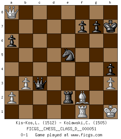 Last move : 0-1 2007 August 4 6:28:28 [Event "FICGS__CHESS__CLASS_D__000051"] [Site "FICGS"] [Date "2007.06.19"] [Round "1"] [White "Kis-Kos,Laszlo"] [Black "Kolawski,Christof"] [Result "0-1"] [WhiteElo "1512"] [BlackElo "1505"] 1.e4 c5 2.Nf3 e6 3.d4 cxd4 4.Nxd4 a6 5.Nc3 Qc7 6.Bd3 Nf6 7.O-O Nc6 8.Be3 Ne5 9.h3 Bc5 10.Kh1 d6 11.f4 Ng6 12.Qe1 O-O 13.f5 Ne5 14.Qh4 Bd7 15.Rf3 exf5 16.R3f1 Ng6 17.Qe1 fxe4 18.Bxe4 Nxe4 19.Nxe4 Rfe8 20.Qf2 Bxh3 21.Nxc5 dxc5 22.gxh3 cxd4 23.Bxd4 Qd7 24.Kh2 Re4 25.c3 Rae8 26.Qg3 Re2+ 27.Rf2 Rxf2+ 28.Bxf2 Qd2 29.b3 h5 30.Kh1 h4 31.Qf3 Re2 32.Rf1 Ne5 33.Qxb7 Qxc3 34.Qa8+ Kh7 0-1 Sicilian : Kan, 5.Nc3 Kingside Castling by player White (move 7) Kingside Castling by player Black (move 12) Player Black won this chess game. Follow this game move after move (download)A thorough understanding of the typical mating continuations makes the most complicated sacrificial combinations leading up to them not only not difficult, but almost a matter of course. (Siegbert Tarrasch) Der zweitbeste Zug ist oft der einzig richtige. (Savielly Grigorievitsch Tartakower) El Ajedrez te enseña a controlarl la excitación inicial que sientes cuando vez algo que parece bueno y te enseña a pensar objetivamente cuando te encuentras en problemas. (Stanley Kubrick) Seul un grand joueur sait à quel point il joue faiblement. (Xavier Tartacover) I just play for fun. (Anna Kournikova)