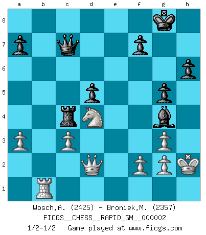 Last move : 1/2-1/2 2019 November 3 8:43:13 [Event "FICGS__CHESS__RAPID_GM__000002"] [Site "FICGS"] [Date "2019.08.10"] [Round "1"] [White "Wosch,Arkadiusz"] [Black "Broniek,Mariusz Maciej"] [Result "1/2-1/2"] [WhiteElo "2425"] [BlackElo "2357"] 1.e4 c5 2.Nf3 Nc6 3.Bc4 e6 4.O-O d5 5.exd5 exd5 6.Bb5 Bd6 7.d4 Nf6 8.Nc3 Be6 9.Bg5 O-O 10.dxc5 Bxc5 11.Qd3 Rc8 12.Rae1 h6 13.Bh4 Re8 14.a3 g5 15.Bg3 Nh5 16.Bxc6 bxc6 17.b4 Nxg3 18.hxg3 Bf8 19.Nd4 Bg4 20.Rxe8 Qxe8 21.Na4 c5 22.Nxc5 Bxc5 23.bxc5 Rxc5 24.Qd2 Rc4 25.Rb1 Qe5 26.c3 Qc7 27.Kh2 1/2-1/2 Sicilian defense Kingside Castling by player White (move 4) Kingside Castling by player Black (move 9) This chess game ended in a draw. Follow this game move after move (download)Botvinnik tried to take the mystery out of Chess, always relating it to situations in ordinary life. He used to call Chess a typical inexact problem similar to those which people are always having to solve in everyday life. (Garry Kasparov) Über Karpov: Er war und ist ein Vertreter der russischen Reaktionäre. Das steckt tief in seiner Seele, wehalb ich nicht nett mit ihm umgehen kann. (Viktor Kortschnoi) Por tratar de evitar la pérdida de una pieza, muchas personas han perdido una partida de Ajedrez. (Savielly Tartakover) Les échecs sont un jeu par leur forme, un art par leur essence et une science par sa difficulté d'acquisition. Ils peuvent vous procurer autant de plaisir qu'un bon livre ou une belle musique, mais vous n'aurez une réelle joie que si vous arrivez à bien jouer. (Tigran Petrosian) You know what they say : You lie down with the Devil, you wake up in Hell. (Horatio Caine, C.S.I. Miami)