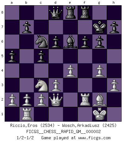 Last move : 1/2-1/2 2019 October 13 19:43:28 [Event "FICGS__CHESS__RAPID_GM__000002"] [Site "FICGS"] [Date "2019.08.10"] [Round "1"] [White "Riccio,Eros"] [Black "Wosch,Arkadiusz"] [Result "1/2-1/2"] [WhiteElo "2534"] [BlackElo "2425"] 1.e4 c5 2.Nc3 Nc6 3.g3 g6 4.Bg2 Bg7 5.d3 d6 6.Be3 e5 7.Qd2 Nge7 8.f4 O-O 9.Nf3 Nd4 10.O-O Bg4 11.Nh4 exf4 12.Rxf4 Be6 13.Rf2 Qb6 14.Rb1 Rae8 15.h3 a5 16.Bh6 Qd8 17.Bxg7 Kxg7 18.Nf3 Nxf3+ 19.Bxf3 Nc6 20.Bg2 f6 21.g4 1/2-1/2 Sicilian : Closed, 6.Be3 Kingside Castling by player Black (move 8) Kingside Castling by player White (move 10) This chess game ended in a draw. Follow this game move after move (download)I don't believe in psychology. I believe in good moves. (Bobby Fischer) Glücklicherweise sind Großmeister Ruben Fines reine Schachbücher weniger phallozentrisch [als seine Schachpsychologie] und deswegen auch weniger lächerlich. (Nigel Short) No es una movida, aún la mejor movida que tu debas buscar, sino un plan comprensible. (Eugene Znosko-Borovsky) Les Echecs représentent une sphère d'idées créatrices basée sur la volonté des deux protagonistes. (Smyslov) The project of the man are lower than those of the sky. (Chinese proverb)