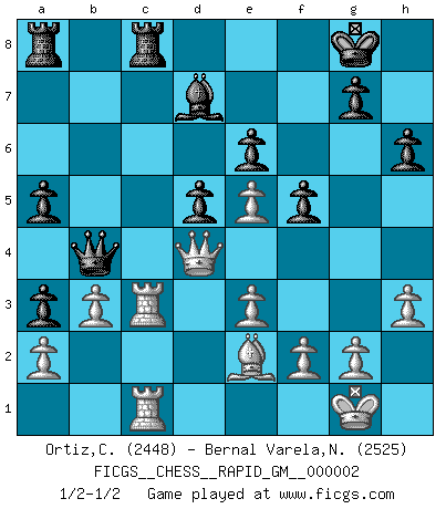 Last move : 1/2-1/2 2019 October 5 14:59:56 [Event "FICGS__CHESS__RAPID_GM__000002"] [Site "FICGS"] [Date "2019.08.10"] [Round "1"] [White "Ortiz,Clodomiro"] [Black "Bernal Varela,Nelson"] [Result "1/2-1/2"] [WhiteElo "2448"] [BlackElo "2525"] 1.Nf3 e6 2.c4 d5 3.d4 c6 4.e3 Nd7 5.b3 Ngf6 6.Bb2 Ne4 7.Nbd2 Bd6 8.Be2 O-O 9.Qc2 f5 10.O-O Qf6 11.Rad1 a5 12.Ne1 Nxd2 13.Rxd2 Qe7 14.Nd3 b5 15.Ne5 Nxe5 16.dxe5 Bb4 17.R2d1 Bd7 18.Rc1 Rfc8 19.cxb5 cxb5 20.Qb1 Bc5 21.Qd3 Ba3 22.Qd4 b4 23.h3 h6 24.Bxa3 bxa3 25.Rc3 Qb4 26.Rfc1 1/2-1/2 Reti Opening Kingside Castling by player Black (move 8) Kingside Castling by player White (move 10) This chess game ended in a draw. Follow this game move after move (download)Chess is not like life... it has rules ! (Mark Pasternak) Wenn Capablanka heute auf der Schachbühne erscheinen würde, hätte er ein halbes Jahr gebraucht um sich die Schachtheorie anzueignen. Und dann hätte er alles und jeden besiegt. (Mikhail Moiseyevich Botvinik) Es el objetivo de la escuela moderna no tratar cada posición de acuerdo a una regla general, sino de acuerdo al principio inherente en la posición. (Richard Reti) Il (Jacob Murray) ne joue pas pour le bon coup, mais pour le meilleur. (Eloi Relange) To be champion requires more than simply being a strong player; one has to be a strong human being as well. (Anatoly Karpov)