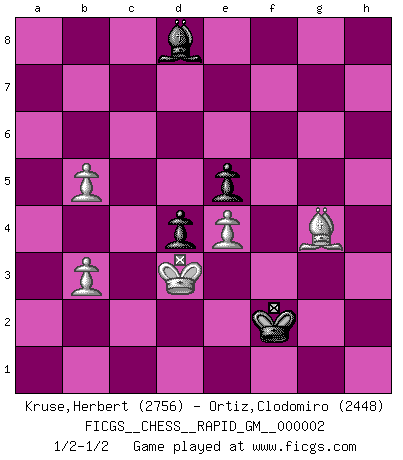 Last move : 1/2-1/2 2019 December 19 20:32:10 [Event "FICGS__CHESS__RAPID_GM__000002"] [Site "FICGS"] [Date "2019.08.10"] [Round "1"] [White "Kruse,Herbert"] [Black "Ortiz,Clodomiro"] [Result "1/2-1/2"] [WhiteElo "2756"] [BlackElo "2448"] 1.Nf3 c5 2.e4 d6 3.d4 cxd4 4.Nxd4 Nf6 5.Nc3 a6 6.f3 e5 7.Nb3 Be6 8.Be3 Be7 9.Qd2 O-O 10.O-O-O Nbd7 11.g4 b5 12.g5 b4 13.Ne2 Ne8 14.f4 a5 15.f5 a4 16.fxe6 axb3 17.cxb3 fxe6 18.Bh3 Rxa2 19.Bxe6+ Kh8 20.Ng3 Nc7 21.Bc4 Qa8 22.Rhf1 Rxf1 23.Rxf1 Ra1+ 24.Kc2 Rxf1 25.Bxf1 d5 26.Qf2 g6 27.h4 Kg7 28.Kb1 Qf8 29.Qg2 d4 30.Bd2 Ne6 31.Qh3 Nec5 32.Bxb4 Qf4 33.Bb5 Qe3 34.Ba3 Nb6 35.Bxc5 Bxc5 36.Ka2 Qd2 37.Ne2 Qa5+ 38.Ba4 Qa7 39.Qe6 Qe7 40.Qh3 Qa7 41.Kb1 Qa8 42.Qf3 Be7 43.Bb5 Qa5 44.Be8 Qe1+ 45.Ka2 Qa5+ 46.Kb1 Qe1+ 47.Kc2 Kh8 48.h5 gxh5 49.g6 Qh4 50.gxh7 Qg4 51.Bxh5 Qxf3 52.Bxf3 Kxh7 53.Nc1 Kg6 54.Nd3 Bd6 55.Bd1 Kg5 56.Be2 Nd7 57.b4 Nf6 58.Bf3 Kh4 59.Nc5 Kg3 60.Bd1 Kf2 61.Kd3 Kg3 62.Bc2 Kf3 63.Bb3 Kg3 64.Be6 Kf3 65.Bf7 Be7 66.Bg6 Bf8 67.Bf7 Bd6 68.Bg6 Kg3 69.Ke2 Ng4 70.Bf7 Nf2 71.Bb3 Bc7 72.Ba4 Kg2 73.Bc6 Nh3 74.Ne6 Bb6 75.Ba4 Kg3 76.Nc5 Nf4+ 77.Kd2 Kf3 78.Bd1+ Kf2 79.Bg4 Bd8 80.Nd3+ Nxd3 81.Kxd3 Be7 82.b5 Bd8 83.b3 1/2-1/2 Reti Opening Kingside Castling by player Black (move 9) Queenside Castling by player White (move 10) 10 pieces endgame at move 80 : White KBPPP , Black KBNPP WHITE : King + 1 Bishop 3 Pawns BLACK : King + 1 Bishop 1 Knight 2 Pawns 9 pieces endgame at move 81 : White KBPPP , Black KBPP WHITE : King + 1 Bishop 3 Pawns BLACK : King + 1 Bishop 2 Pawns This chess game ended in a draw. Follow this game move after move (download)Good positions don't win games, good moves do. (Gerald Abrahams) Schach ist mein Leben, meine Leidenschaft, was ich gelernt habe und seit meinem 14. Lebensjahr profimässig praktiziere. Darauf zu verzichten, würde mir sehr schwer fallen. (Viktor Kortschnoi) Cuando le juegas a Fischer, no es una cuestion de si vas a ganar o perder. Es una cuestion de si vas a sobrevivir. (Boris Spassky) On a dit que l'homme se distingue de l'animal par le fait qu'il achète plus de livres qu'il ne peut en lire. Je voudrais suggérer qu'inclure à la liste des livres quelques livres d'échecs rendrait la distinction manifeste. (Edward Lasker) Always remember that you are unique; just like everyone else. (Unknown)