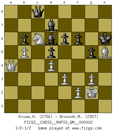 Last move : 1/2-1/2 2020 February 23 18:59:48 [Event "FICGS__CHESS__RAPID_GM__000002"] [Site "FICGS"] [Date "2019.08.10"] [Round "1"] [White "Kruse,Herbert"] [Black "Broniek,Mariusz Maciej"] [Result "1/2-1/2"] [WhiteElo "2756"] [BlackElo "2357"] 1.d4 Nf6 2.c4 e6 3.g3 d5 4.Nf3 Bb4+ 5.Bd2 Be7 6.Bg2 O-O 7.O-O Nbd7 8.Qc2 c6 9.a4 b6 10.Rc1 Ba6 11.b3 Ne4 12.e3 Bb7 13.a5 Rc8 14.Nc3 Nxd2 15.Qxd2 Bb4 16.axb6 axb6 17.Ra7 Rc7 18.cxd5 cxd5 19.Nb5 Rxc1+ 20.Qxc1 Qb8 21.Bf1 Rc8 22.Qb1 g6 23.Ra1 Be7 24.Na7 Rc7 25.Nb5 Rc8 26.Ra2 Bf8 27.Na7 Rc7 28.Nb5 Rc8 29.h3 Be7 30.Qb2 Bf8 31.Na7 Rc7 32.Nb5 Rc8 33.Be2 Bg7 34.Na7 Rc7 35.Nb5 Rc8 36.Na7 Rc7 37.Bf1 Bf8 38.Qa1 Bg7 39.Nb5 Rc8 40.Na7 Rc7 41.h4 Nc5 42.Nb5 Rc8 43.b4 Nd7 44.Na7 Rc7 45.h5 Qf8 46.Nb5 Rc8 47.Qb1 Ra8 48.Rc2 Rc8 49.Ra2 Ra8 50.Rc2 Rc8 51.hxg6 hxg6 52.Ra2 Ra8 53.Rc2 Rc8 54.Na7 Rxc2 55.Qxc2 Qd6 56.Kg2 Bf6 57.Bb5 Nb8 58.Be2 Nc6 59.Nxc6 Qxc6 60.Qa2 Qc8 61.b5 Kg7 62.Qd2 Qc7 63.Qb2 Be7 64.Ne5 f6 65.Nc6 Bd6 66.Qc1 Bc8 67.Qa1 Bd7 68.Qa8 Qc8 69.Qa4 g5 70.Bh5 Kh6 71.Be2 Kg7 72.Bh5 Kh6 1/2-1/2 Catalan Opening Kingside Castling by player Black (move 6) Kingside Castling by player White (move 7) This chess game ended in a draw. Follow this game move after move (download)Fischer was a master of clarity and a king of artful positioning. His opponents would see where he was going but were powerless to stop him. (Bruce Pandolfini) Kein Schachspieler kann gut schlafen. (H. G. Wells) Los Peones son nacidos libres, y aún así, se encuentran por doquier encadenados. (Rick Kennedy) Aux échecs, l'amour-propre est satisfait quand on remporte la victoire, mais il n'y a pas de honte à être battu. (Benjamin Franklin) Without enthusiasm, virtue functions not at all, and vice only poorly. (Mignon McLaughlin, The Neurotic's Notebook, 1960)