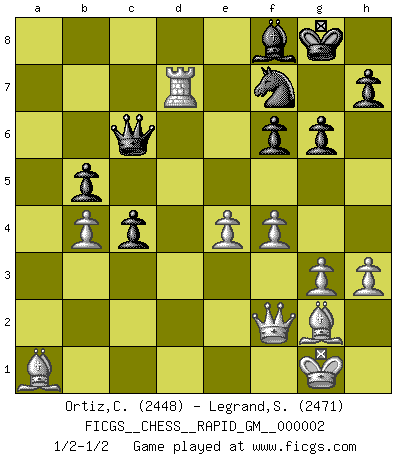 Last move : 1/2-1/2 2019 October 23 22:48:3 [Event "FICGS__CHESS__RAPID_GM__000002"] [Site "FICGS"] [Date "2019.08.10"] [Round "1"] [White "Ortiz,Clodomiro"] [Black "Legrand,Stephane"] [Result "1/2-1/2"] [WhiteElo "2448"] [BlackElo "2471"] 1.d4 Nf6 2.c4 e6 3.Nf3 d5 4.Nc3 c6 5.e3 Nbd7 6.Be2 Bd6 7.O-O O-O 8.Qc2 dxc4 9.Bxc4 b5 10.Bd3 Bb7 11.e4 e5 12.h3 a6 13.dxe5 Nxe5 14.Nxe5 Bxe5 15.Be3 Re8 16.a4 Qe7 17.Ne2 Bd6 18.Nd4 g6 19.Nf3 Qc7 20.b3 Rac8 21.Bd4 Nd7 22.Rad1 c5 23.Ba1 Bc6 24.Rfe1 f6 25.Qe2 Rb8 26.Qd2 Re6 27.Bf1 Bf8 28.b4 c4 29.Nd4 Re7 30.g3 Ne5 31.f4 Nf7 32.Nxc6 Qxc6 33.Bg2 Rd8 34.axb5 axb5 35.Qf2 Rxd1 36.Rxd1 Rd7 37.Rxd7 1/2-1/2 Queen's pawn game Kingside Castling by player White (move 7) Kingside Castling by player Black (move 7) This chess game ended in a draw. Follow this game move after move (download)Openings teach you openings. Endgames teach you chess ! (Stephan Gerzadowicz) Die Partien sind immer verschieden, die Interviews immer die gleichen. (Garry Kasparov) El Ajedrez es un cuento de Hadas de las 1001 metidas de pata. (Savielly Tartakower) Fischer est le meilleur joueur du monde et Karpov n'est qu'un joueur de bistrot. (Garry Kasparov, agé de 16 ans) When I took office, only high energy physicists had ever heard of what is called the World Wide Web... Now even my cat has its own page. (Bill Clinton, 1996)