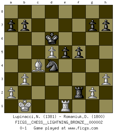 Last move : 0-1 2008 February 13 12:37:42 [Event "FICGS__CHESS__LIGHTNING_BRONZE__000002"] [Site "FICGS"] [Date "2008.02.13"] [Round "1"] [White "Lupinacci,Nicola"] [Black "Romaniuk,Dmytro"] [Result "0-1"] [WhiteElo "1381"] [BlackElo "1800"] 1.e4 c6 2.d4 d5 3.Nc3 dxe4 4.Nxe4 Nd7 5.Nf3 Ngf6 6.Nxf6+ Nxf6 7.c4 Bg4 8.Be2 e6 9.Be3 Bb4+ 10.Bd2 Bxd2+ 11.Qxd2 Ne4 12.Qb4 Qe7 13.Qxe7+ Kxe7 14.h3 Bxf3 15.Bxf3 Nd6 16.b3 Nf5 17.d5 cxd5 18.cxd5 Nd4 19.O-O-O e5 20.Rhe1 Rac8+ 21.Kb1 Kd6 22.Rc1 f5 23.Rxc8 Rxc8 24.Be2 Rc2 25.Bc4 Rxf2 0-1 Caro-Kann : Steinitz variation Queenside Castling by player White (move 19) Player Black won this chess game. Follow this game move after move (download)There are two types of sacrifices: correct ones and mine. (Mikhail Tal) Wie bekannt hörte Morphy 1859 auf, Schach zu spielen. Seine Enttäuschung galt nicht so sehr dem Schach, wie den Schachspielern. (Robert James Fischer) Diferente gente reacciona diferentemente en aceptar la derrota. (Bobby Fischer) Vouloir jouer aux échecs contre soi-même est aussi paradoxal que vouloir marcher sur son ombre. (Stefan Zweig) I fear not the man who has practiced 10,000 kicks once, but I fear the man who has practiced one kick 10,000 times. (Bruce Lee)
