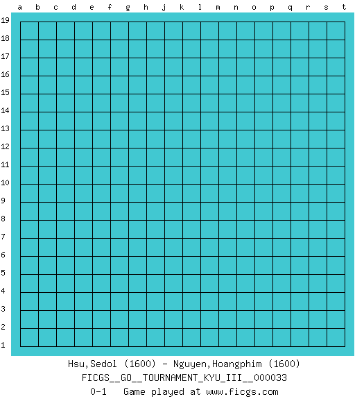 Last move : 0-1 2019 September 10 5:13:24 [Event "FICGS__GO__TOURNAMENT_KYU_III__000033"] [Site "FICGS"] [Date "2019.08.10"] [Round "1"] [Black "Hsu,Sedol"] [White "Nguyen,Hoangphim"] [Result "0-1"] [Rating 1 "1600"] [Rating 2 "1600"] 0-1 This go game has been lost on time (started : 2019.08.10 23:6:37) Here are the names of the openings (joseki) played in the four corners : Player White won this Go (weiqi, baduk) game. Follow this game move after move (download)When your opponent has two weak groups, attack them both at once. (Anonymous) The quality of decision is like the well-timed swoop of a falcon which enables it to strike and destroy its victim. (Sun Tzu)
