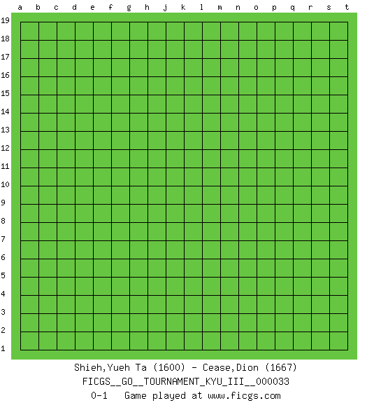 Last move : 0-1 2019 September 10 5:13:24 [Event "FICGS__GO__TOURNAMENT_KYU_III__000033"] [Site "FICGS"] [Date "2019.08.10"] [Round "1"] [Black "Shieh,Yueh Ta"] [White "Cease,Dion"] [Result "0-1"] [Rating 1 "1600"] [Rating 2 "1667"] 0-1 This go game has been lost on time (started : 2019.08.10 23:6:37) Here are the names of the openings (joseki) played in the four corners : Player White won this Go (weiqi, baduk) game. Follow this game move after move (download)Don't count territory held by only one eye. (Anonymous) A person who never made a mistake never tried anything new. (Albert Einstein)